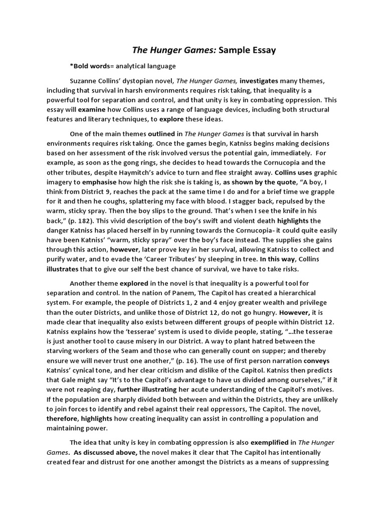 When the games take a turn, Katniss is surprised. Two people can win, but they have to be from the same district. Katniss hears this and her first reaction is screaming Peetas name Katniss knows Peeta is injured because what Cato and the careers said Katniss knows she will become more vulnerable, but she still has to go after him. After she finds him, Katniss has a bigger problem then she thought. Peeta is very ill and hurt The only thing Katniss can do is nurse Peeta back to health, essay on the hunger games book. Peeta is getting worse and needs medicine. Katniss knows it may be impossible. At this stage in the games, medicine and other supplies are very expensiveWhen Katniss gets a chance to go to the Cornucopia, Peeta will not let her Katniss does not care.